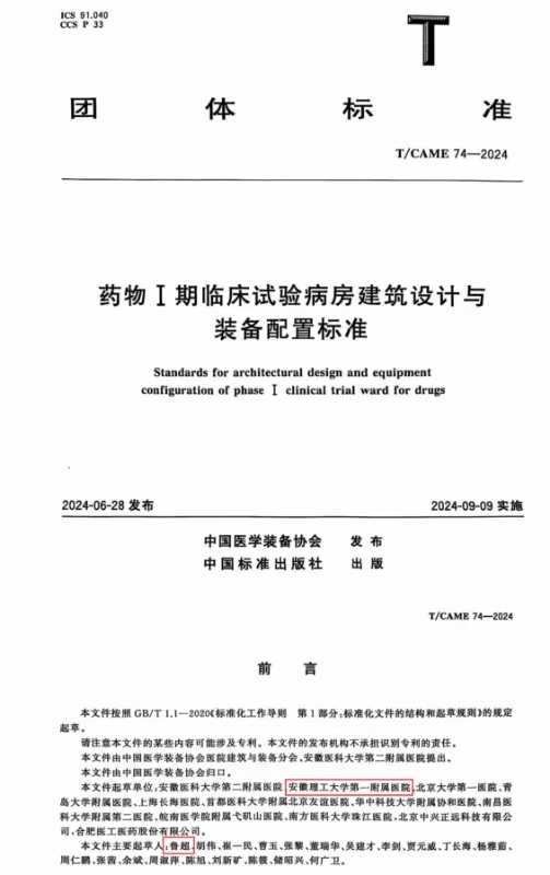 近日,校党委常委、副校长、医学部主任兼院党委书记鲁超以第一起草人完成了团体标准T/CAME 74-2024《药物I期临床试验病房建筑设计与装备配置标准》制定并发布实施。该标准由中国医学装备协会发布,参加单位有安徽医科大学第二附属医院,安徽理工大学第一附属医院,北京大学第一医院等单位。该标准规定了各级各类医院药物I期临床试验病房建设的基本要求、功能区域划分及要求。在我院人员和有关单位及技术人员的共同努力下,经过立案、起草、征求意见、修改、技术审查,最终成功制定并于2024年6月28日正式发布,2024年9月9日实施。