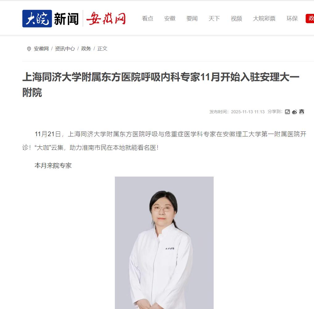 安徽网报道:上海同济大学附属东方医院呼吸内科专家11月开始入驻安理大一附院