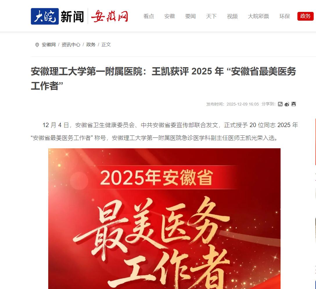 安徽网报道:医院急诊医学科副主任医师王凯获评 2025 年 “安徽省最美医务工作者”