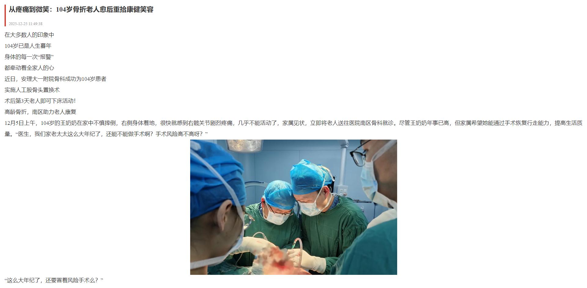 淮南日报报道:从疼痛到微笑:104岁骨折老人愈后重拾康健笑容