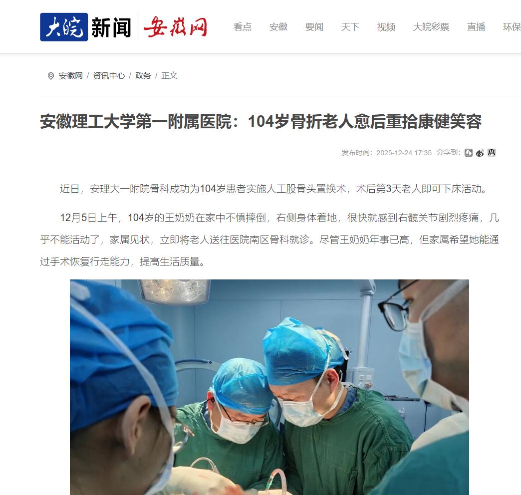 安徽网报道:104岁骨折老人愈后重拾康健笑容