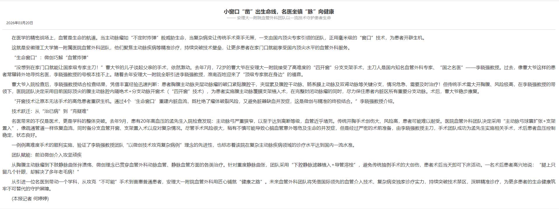 淮南日报报道:医院血管外科团队以一流技术守护患者生命