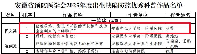 近日,由安徽省预防医学会主办的2025 年度出生缺陷防控科普作品征集活动评选结果新鲜出炉,我院妇产科副主任医师杨芳独立绘制创作的科普漫画《致准爸妈:别让“沉默的甲状腺”成为宝宝到来的“绊脚石”》荣获大赛图文类一等奖!