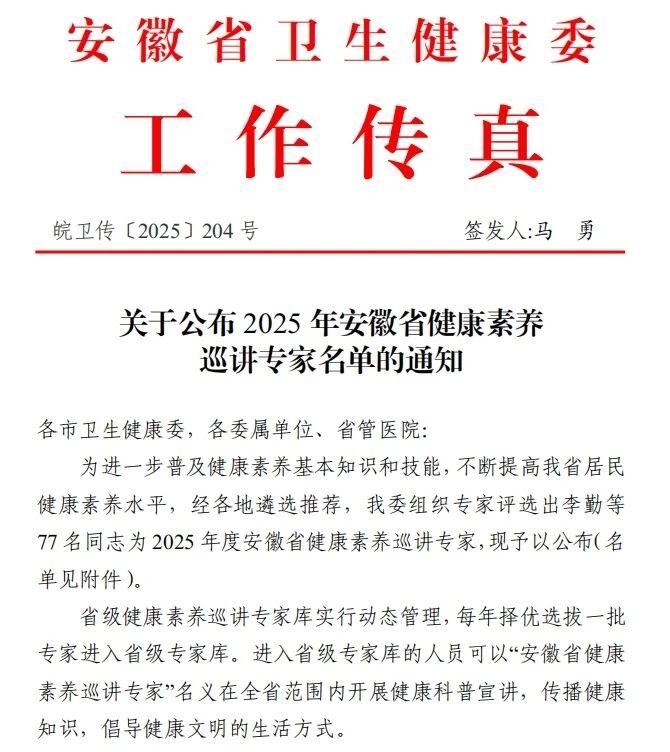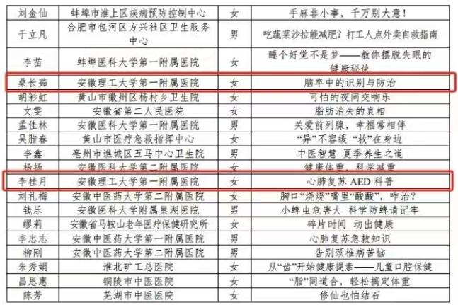 近日,安徽省卫健委正式公布了2025年度安徽省健康素养巡讲专家名单,医院120急救站李桂月和神经内科桑长茹两位护理专家凭借扎实的专业素养和深厚的健康科普功底,成功入选省级健康素养巡讲专家库!