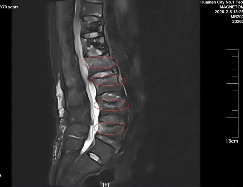然而,骨质疏松带来的脆弱骨骼,让方奶奶的生活依然需要小心翼翼。今年2月,一次不经意的转身,熟悉的剧痛再次袭来。检查结果显示,她的腰椎又出现了新的“塌方”——L2到L5四个节段发生了压缩性骨折。