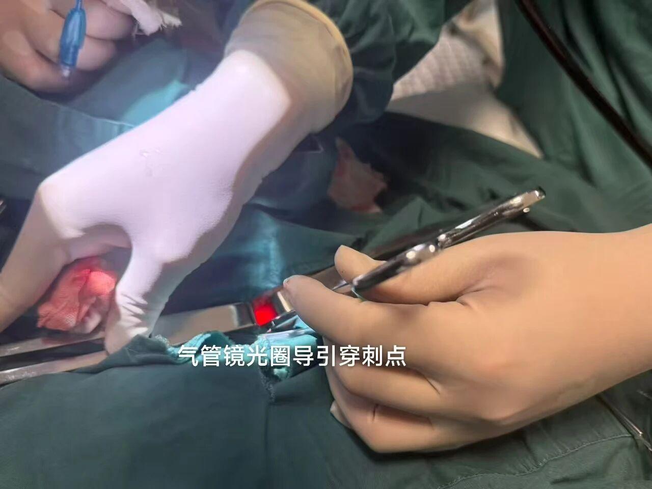 常规的“开路”方法已失效,团队必须要在布满瘢痕的“雷区”中,重新开辟一条生路。“不能硬切,只能精准穿刺!”团队经过严密评估,制定了个体化救治方案:放弃传统切开,采用支气管镜全程定位,开展气道穿刺置管!