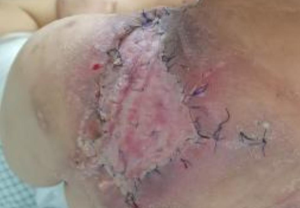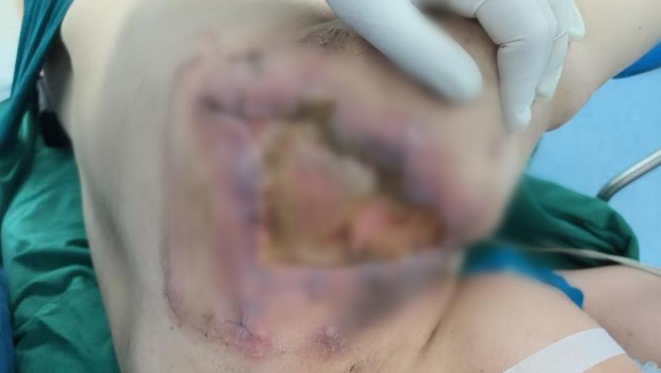 这位患者来院时面色苍白,颈部肿胀,用手捂着患处,步履蹒跚地走进我院烧伤整形科诊室。医生判断:这是坏死性筋膜炎!这个起病急、进展快、致死率极高的“隐形杀手“,正以惊人的速度吞噬着她的生命。
