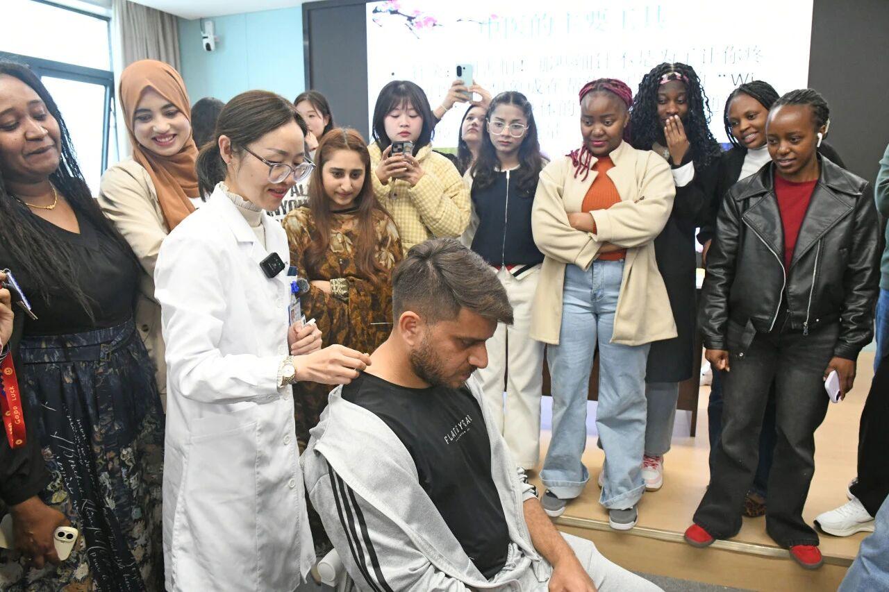 当细如发丝的银针轻轻刺入穴位,原本紧张的他们脸上逐渐浮现出惊喜的神情——“不疼!是一种很轻松的感觉!”来自巴基斯坦的留学生法里瞪大了眼睛,向同伴们描述着这种奇妙的体验。这种近距离感受中医理疗独特魅力的机会,让他对“银针治百病”的传说有了最直观的认知。