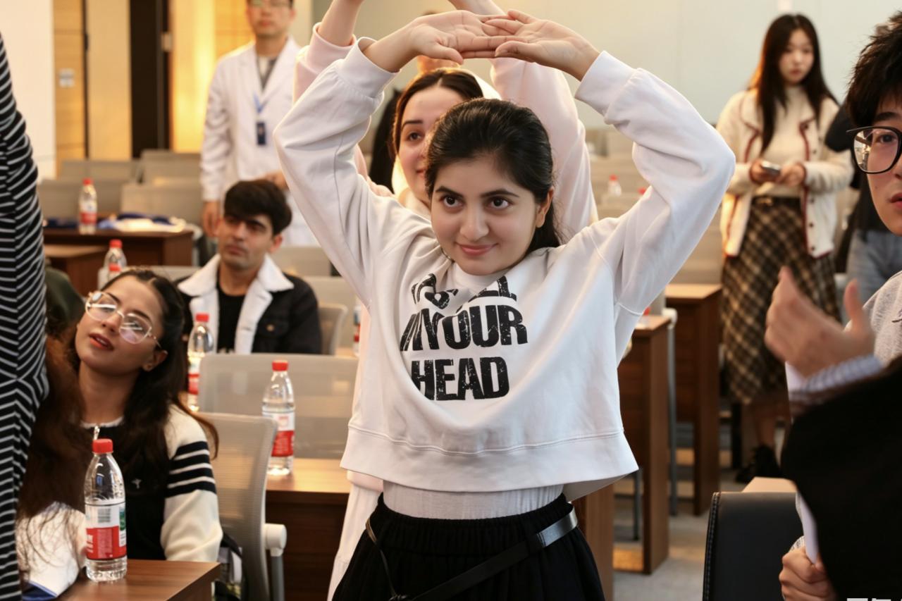 伴随着悠扬的音乐,留学生们摆开架势,跟着中医专家一招一式地比划起八段锦来。“双手托天理三焦”、“左右开弓似射雕”,虽然动作略显笨拙,但每个人都学得格外认真。当大家发现这套看似简单的动作做完后,身体竟真的感到舒展放松、微微发热时,现场爆发出阵阵惊叹。乌兹别克斯坦女孩兴奋地表示:“这就像中国功夫一样!做完这套动作,我的手在发热。”通过这种“玩中学、学中悟”的趣味互动,原本高深莫测的中医理论,瞬间变成了触手可及的快乐体验。