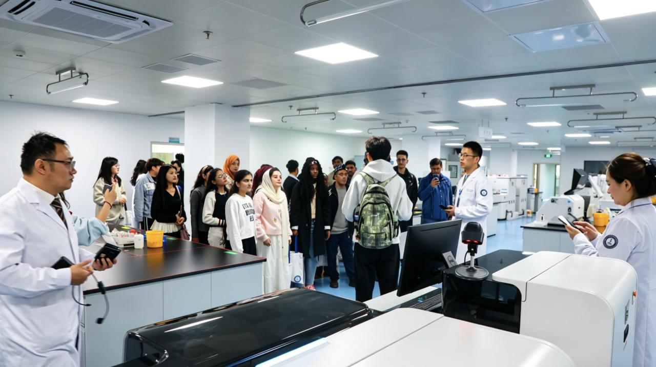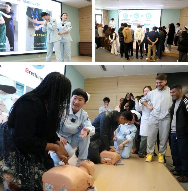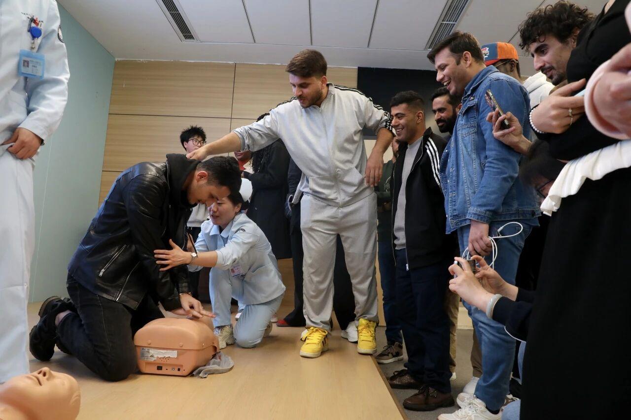 急诊急救中心两位专家全程使用英语,流畅完成了急救知识讲解,并为同学们演示了海姆立克急救法和心肺复苏的标准化操作流程。留学生们在导览人员的带领下,有序参观了南区检验科与影像中心,了解了现代化医院的运作流程。