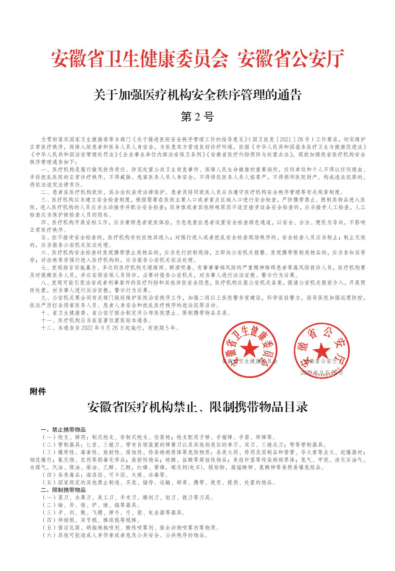 我院按照省卫建委、省公安厅《关于加强医疗机构安全秩序管理的通告》(第2号)文件指示要求,在我院主要入口进行安全检查,严禁携带禁止、限制类物品进入医院,请广大就诊患者主动接收并配合检查。