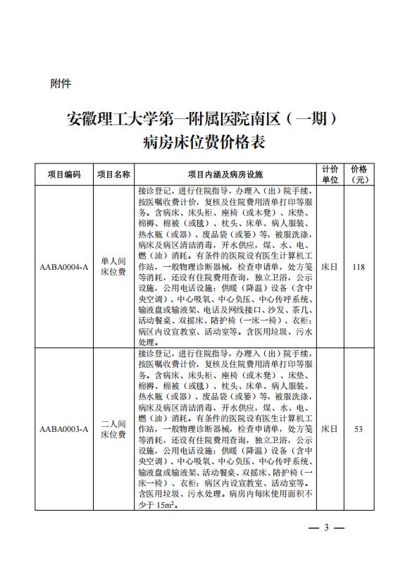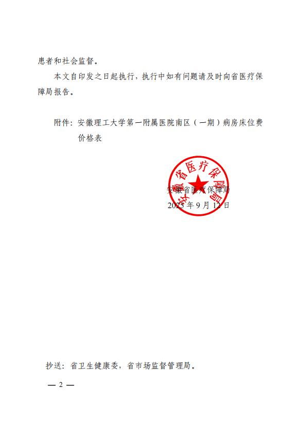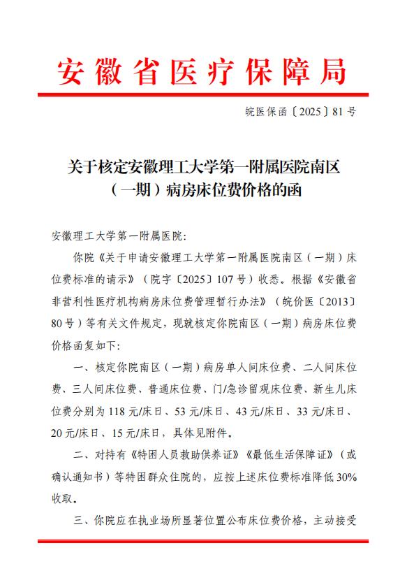 关于核定安徽理工大学第一附属医院南区 (一期)病房床位费价格的函(皖医保函〔2025〕81 号)