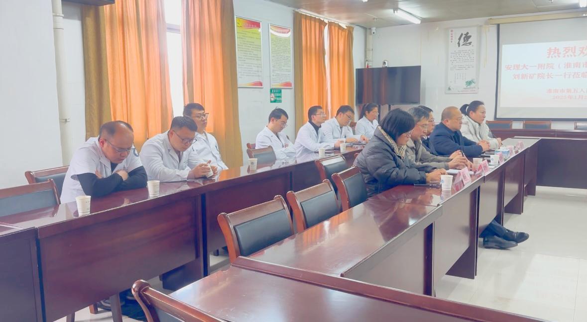 2025年1月26日下午,新春佳节前夕,为了表达对我院驻点帮扶专家们的深切关怀与节日问候,我院党委副书记、执行院长刘新矿前往淮南市第五人民医院(以下简称“市五院”),亲切看望并慰问了在此驻点帮扶的专家们。院党委委员、副院长谢应海,院相关部门负责人陪同。市五院领导班子及全体驻点帮扶专家参加了本次活动。