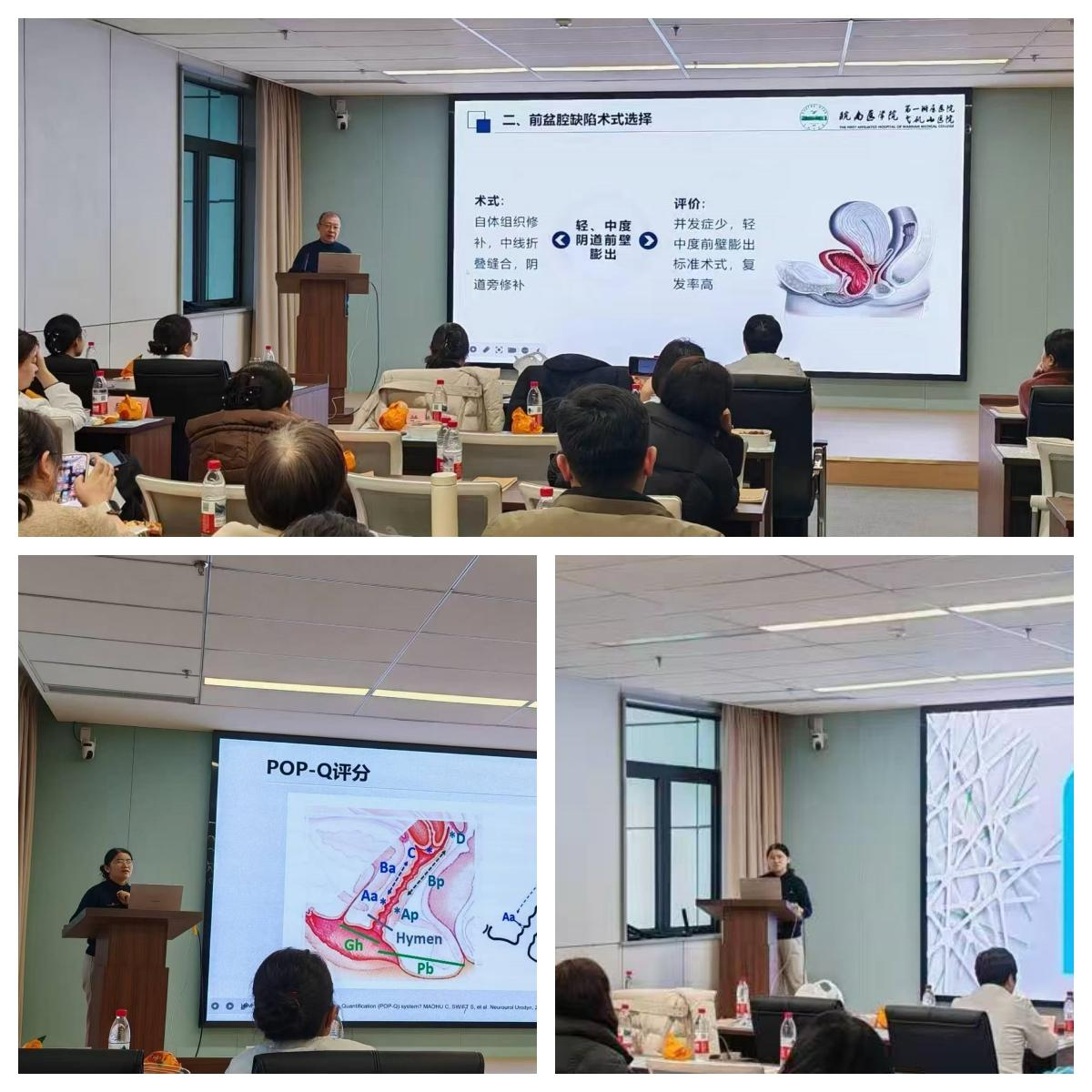 手术圆满完成后,由江淮名医、医院妇产科主任、主任医师周萍主持,专家团队随即开展了一场高水平的专题教学培训。倪观太教授结合自身临床经验,通过一个个经典病例复盘,详细讲解了不同类型脱垂患者的个体化治疗方案制定思路,让在场所有医护人员受益匪浅;施素华教授以生动幽默的授课方式,对POP-Q评分进行了细致拆解讲解,帮助大家突破记忆难点,精准掌握生殖器脱垂评分标准;朱诚程教授则围绕女性尿失禁诊疗开展系统教学,从诊断、治疗到术后康复,全方位提供了可落地、可复制的临床方案,有效补齐了我院及区域内医护人员在相关领域的知识短板。