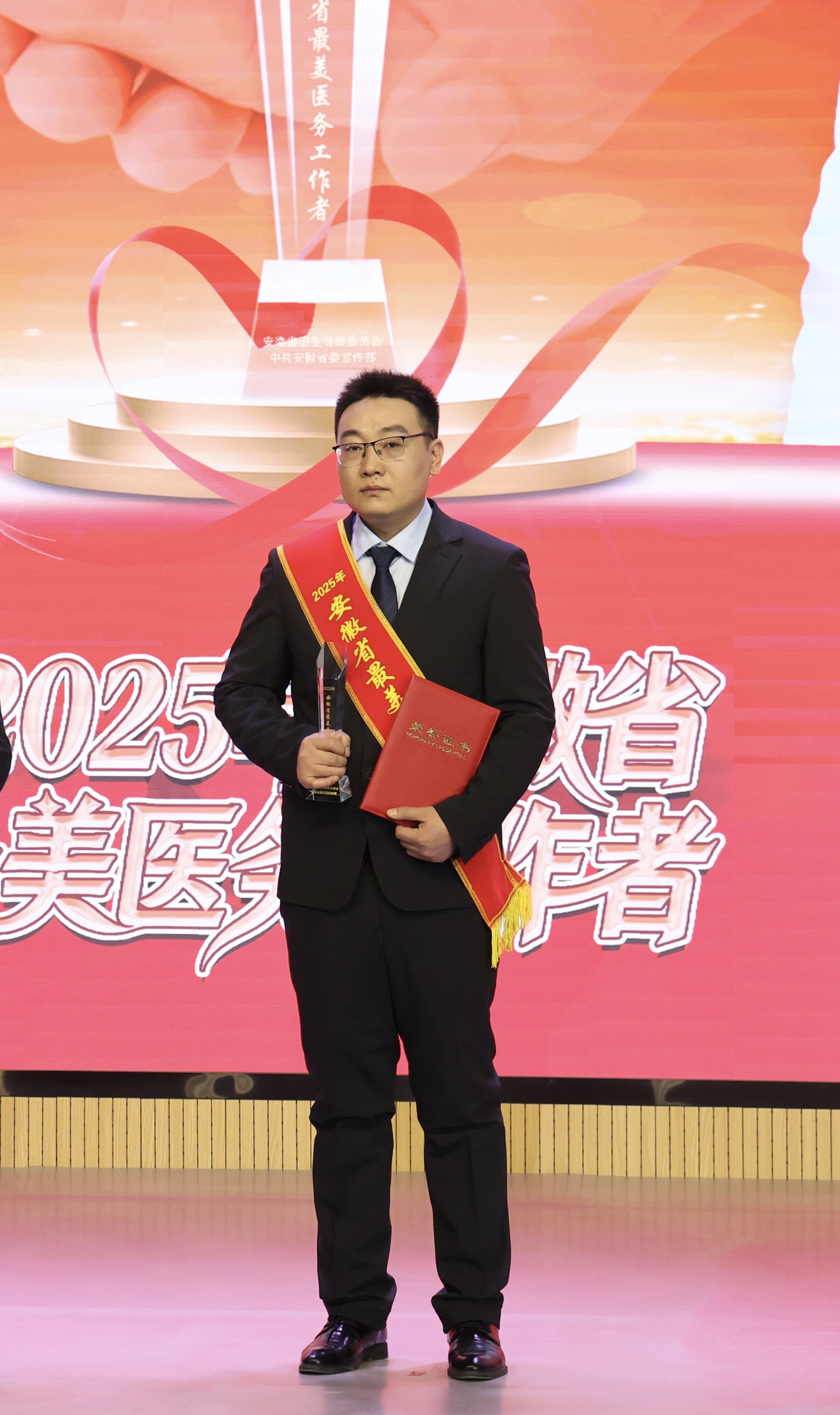当晚,全省医务系统的优秀代表齐聚一堂,共赴这场致敬生命的盛会。医院急诊科副主任王凯凭借精湛的专业能力、深厚的人文情怀以及长期扎根临床一线的无私奉献精神,在众多候选人中脱颖而出,成功获评2025年“安徽省最美医务工作者”荣誉称号,与全省其他19位优秀医务工作者一同登台受奖。